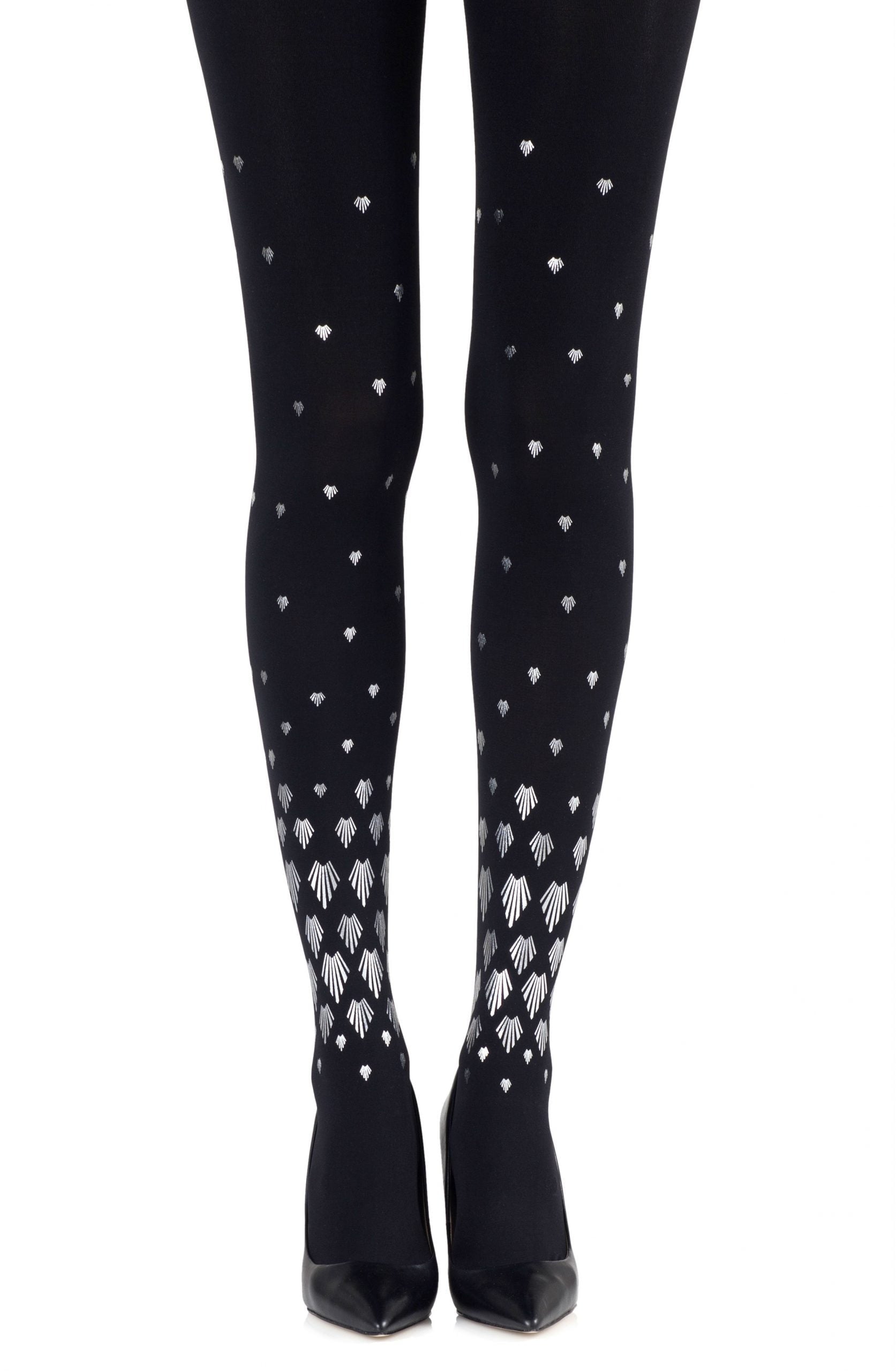 Relax knowing you look sea-riously beautiful in our Shell Out tights that feature a shell-inspired allover print. Colour: Black tights with Silver print. Thickness: 120 denier. Your entire leg will be getting Zohara love with allover prints. Both sides are not created equal with allover tights so please look at the foot of the tights before wearing to ensure you don't step on the print. (The front print will be lower than the back.) No doubt you will shine with our metallic prints. Please note that these prints require extra care when washing and will naturally fade with wear. Unless they have X-ray vision no one will be able to see through these opaque tights. Hand print no two are the same.